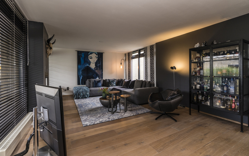 In dit huis hebben we alle meubels en raambekleding verzorgd. De wens was om niet teveel kleur te gebruiken. Omdat we met name met zwarte tinten hebben gewerkt, besloten we de woning aan te kleden met blauwe tinten. Hierdoor lopen de kleuren in elkaar over en zijn er sfeervolle ruimtes gecreëerd.